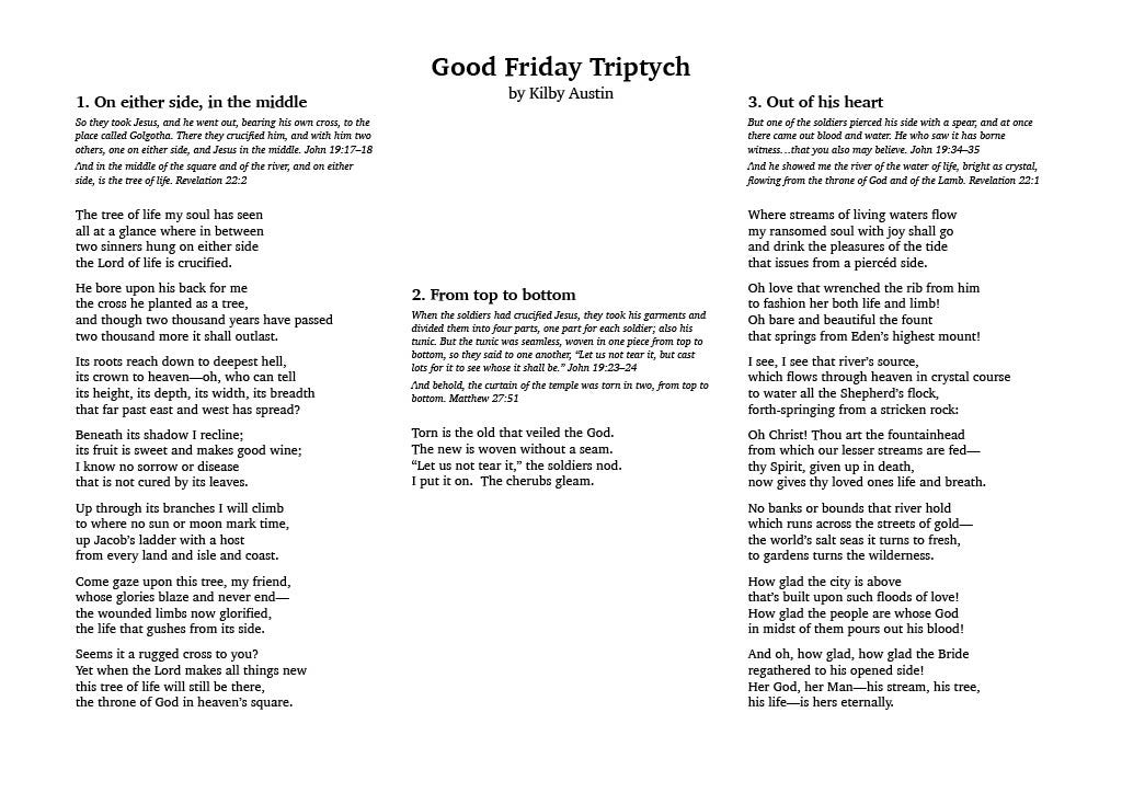 A Good Friday Triptych By Kilby Austin 1. On either side, in the middle So they took Jesus, and he went out, bearing his own cross, to the place called Golgotha. There they crucified him, and with him two others, one on either side, and Jesus in the middle. John 19:17–18 And in the middle of the square and of the river, and on either side, is the tree of life. Revelation 22:2 The tree of life my soul has seen all at a glance where in between two sinners hung on either side the Lord of life is crucified. He bore upon his back for me the cross he planted as a tree, and though two thousand years have passed two thousand more it shall outlast. Its roots reach down to deepest hell, its crown to heaven—oh, who can tell its height, its depth, its width, its breadth that far past east and west has spread? Beneath its shadow I recline; its fruit is sweet and makes good wine; I know no sorrow or disease that is not cured by its leaves. Up through its branches I will climb to where no sun or moon mark time, up Jacob’s ladder with a host from every land and isle and coast. Come gaze upon this tree, my friend, whose glories blaze and never end— the wounded limbs now glorified, the life that gushes from its side. Seems it a rugged cross to you? Yet when the Lord makes all things new this tree of life will still be there, the throne of God in heaven’s square. 2. From top to bottom When the soldiers had crucified Jesus, they took his garments and divided them into four parts, one part for each soldier; also his tunic. But the tunic was seamless, woven in one piece from top to bottom, so they said to one another, “Let us not tear it, but cast lots for it to see whose it shall be.” John 19:23–24 And behold, the curtain of the temple was torn in two, from top to bottom. Matthew 27:51 Torn is the old that veiled the God. The new is woven without a seam. “Let us not tear it,” the soldiers nod. I put it on. The cherubs gleam. 3. Out of his heart But one of the soldiers pierced his side with a spear, and at once there came out blood and water. He who saw it has borne witness…that you also may believe. John 19:34–35 And he showed me the river of the water of life, bright as crystal, flowing from the throne of God and of the Lamb. Revelation 22:1 Where streams of living waters flow my ransomed soul with joy shall go and drink the pleasures of the tide that issues from a piercéd side. Oh love that wrenched the rib from him to fashion her both life and limb! Oh bare and beautiful the fount that springs from Eden’s highest mount! I see, I see that river’s source, which flows through heaven in crystal course to water all the Shepherd’s flock, forth-springing from a stricken rock: Oh Christ! Thou art the fountainhead from which our lesser streams are fed— thy Spirit, given up in death, now gives thy loved ones life and breath. No banks or bounds that river hold which runs across the streets of gold— the world’s salt seas it turns to fresh, to gardens turns the wilderness. How glad the city is above that’s built upon such floods of love! How glad the people are whose God in midst of them pours out his blood! And oh, how glad, how glad the Bride regathered to his opened side! Her God, her Man— his stream, his tree, his life—is hers eternally.